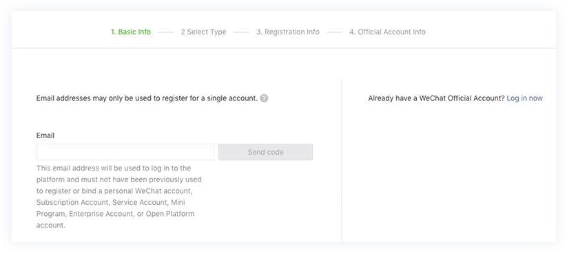 输入您将用于登录和管理微信官方账户的邮箱。微信会将验证码发送到该邮箱。