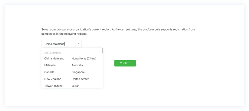 选择您公司注册的国家。如果您使用的是第三方本地许可证,请选择“中国大陆”。
