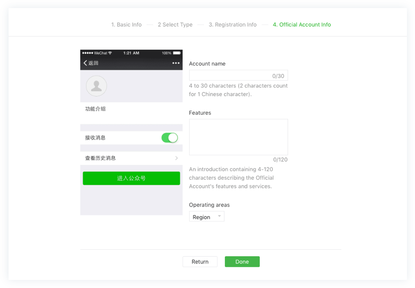 注意:使用国际账户时,微信官方账号的功能会受到限制,且未获批准的风险较高。