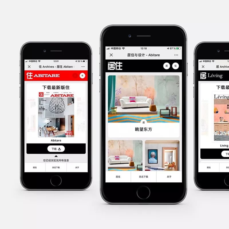 此次设计的独特UI挑战在于将两个不同的视觉识别系统结合在一个微信小程序中。我们保留了Abitare的独特红色,并通过使用不同大小的图片,重现了Living杂志的排版风格。考虑到中国观众的需求,我们将Abitare和Living在联合新闻推送中进行本地化处理。我们将中文标志和名称中的两个部分分开,Abitare(住)和Living(居),以创建新闻推送筛选功能。