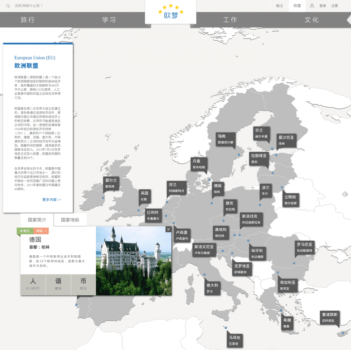 该网站共有四个主要板块-文化,工作,学习和旅游。值得一提的特色就是文娱活动表和交互式地图,访客可以在这里了解各成员国的概况以及他们组织的一些文化娱乐活动。各成员国可以自主更新自己在平台上发布的内容,各国大使们也完全可以根据自己国家的情况添加一些更加人性化的温馨提示。