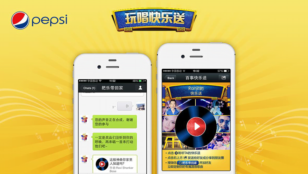 2014年,百事公司在其名为“把乐带回家”的重大新年营销活动中,就利用了微信的语音录制和上传功能。在该活动中,人们可以在微信上录制一段声音,发送给百事的官方微信,然后就可以获得与众所周知的“快乐颂”主题曲的混音版了。然后,将这个特殊的新年祝福发送给自己的亲友,让传统的祝福活动带上时尚而温馨的旋律。当然,与此同时百事也巧妙达到了用主题曲传达品牌信息的效果。