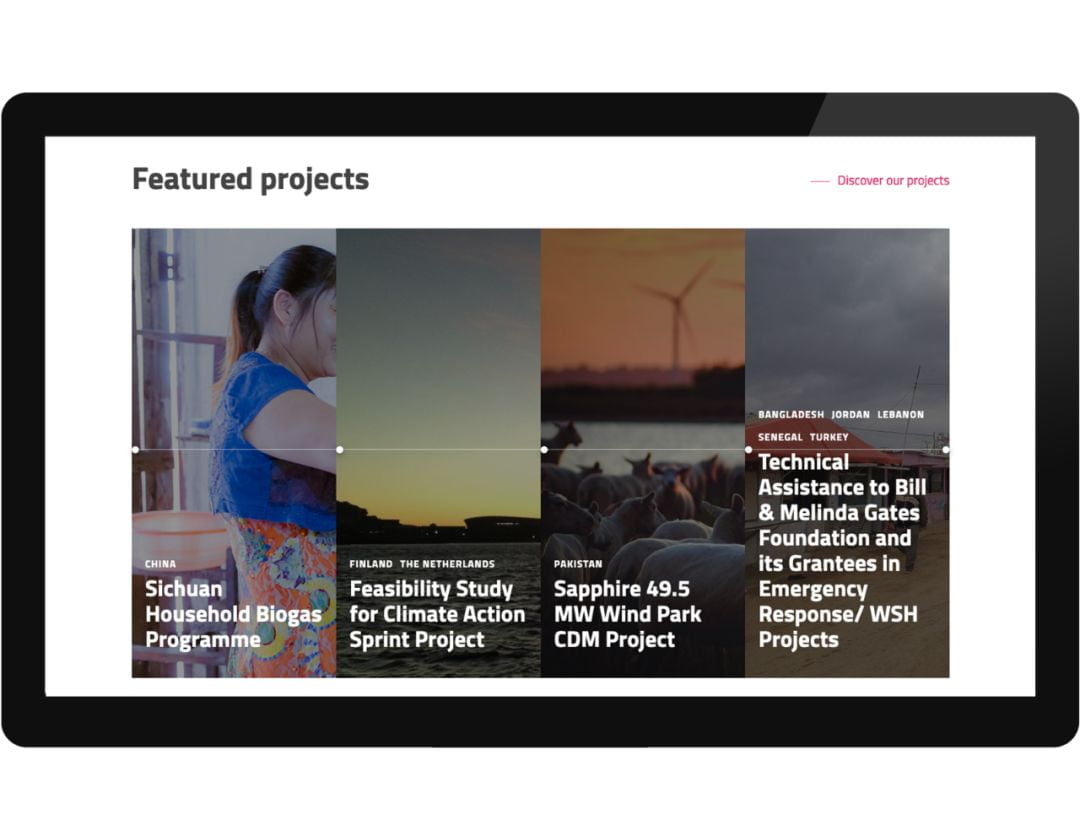 首页旨在讲述 UPM 的工作和积极愿景。一进入网站,访客会看到被雾霾笼罩的美丽山脉,并可以选择清除这些雾霾(仅限桌面版)。每个后续部分都以对话式、主动的层级和语调呈现故事的不同组成部分。我们希望那些访问网站有明确目的的人能够轻松找到相关信息,同时在浏览过程中发现意想不到的信息。重点放在清晰的标题和真实的图片展示上,让人、地点和工作能够自我表达。