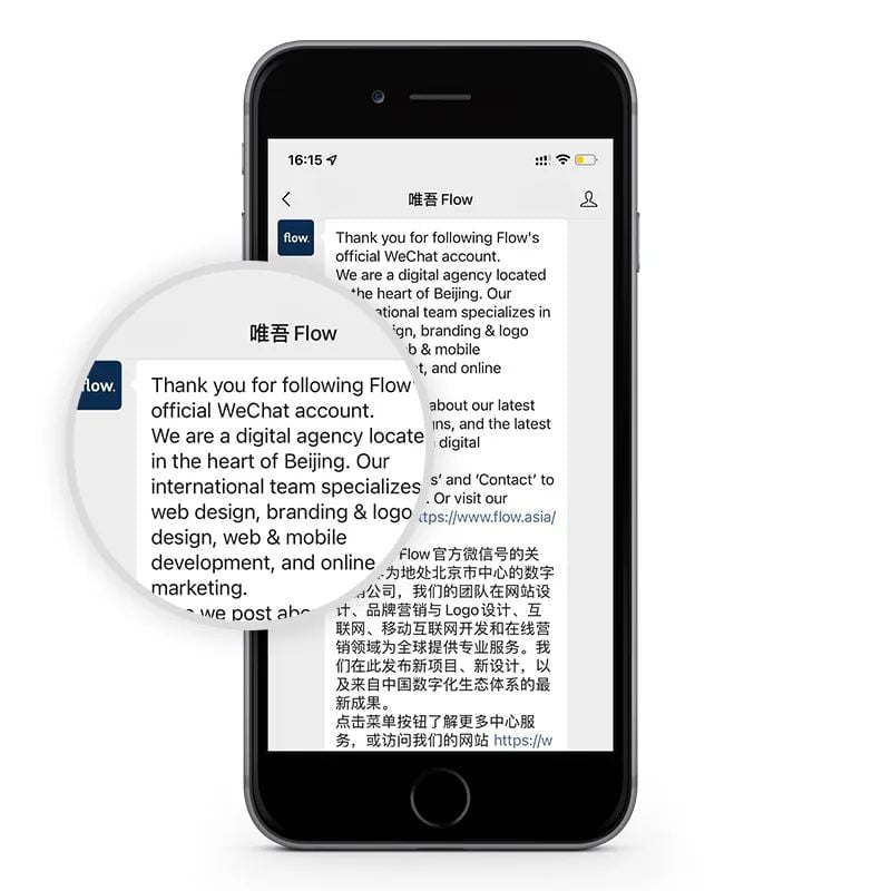 Flow 是一家创意代理公司,专注于帮助组织在中国进行品牌塑造和数字化展示。我们提供视觉形象设计、微信公众号开发、小程序制作、网站设计以及营销材料设计服务。如果您需要在中国制定营销策略,欢迎联系我们获取定制报价。
