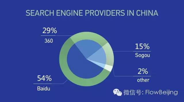 2014年,百度虽仍以54.02%的市场份额领跑(2013年该数据为64%),但其竞争对手正在迅速赶上来。居于第二位的是靠杀毒软件起家的奇虎旗下的360搜索,现在其占有率已达29%(2013年为18%),另外一个是搜狗,排名第三,占有近15%的市场份额。
